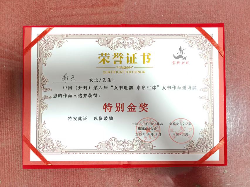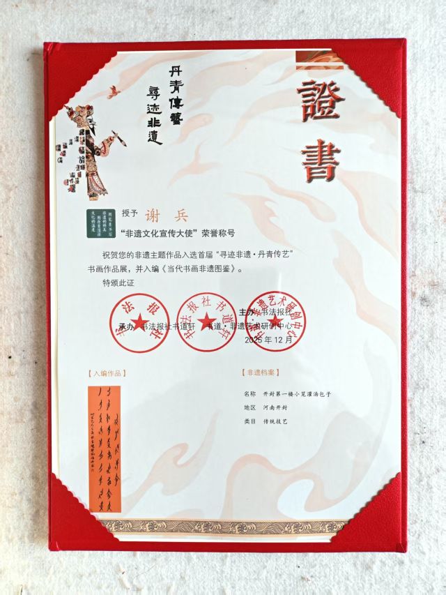 谢兵受邀参与首届“寻迹非遗·丹青传艺”书画作品展,以及中国(开封)第六届“女书遗韵 素帛生炜”女书作品邀请展,他凭借融合女书书法与开封小笼包非遗主题的作品,一举斩获“特别金奖”,并荣膺“非遗文化宣传大使”称号,相关作品也成功入编《当代书画非遗图鉴》。