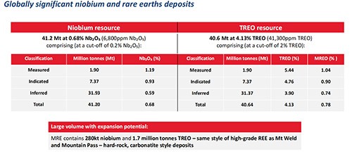 阿拉莎铌稀土矿山位于巴西著名的铌稀土成矿带阿拉莎地区,与世界第一大铌矿CBMM同区。目前,该矿具备JORC标准资源含28万吨铌,170万吨稀土,品位分别为0.68%和4.13%。