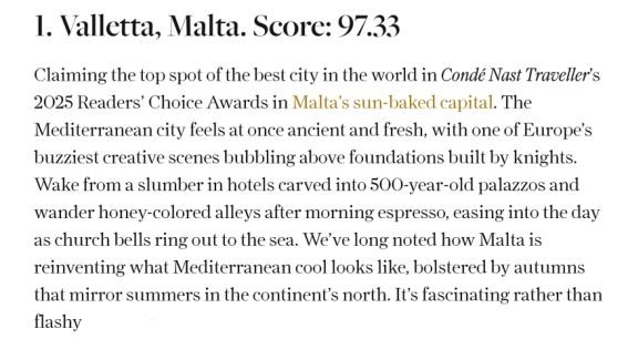 近日,旗下拥有《Vogue》《GQ》等知名杂志的康泰纳仕Condé Nast国际期刊集团将马耳他首都瓦莱塔评为2025年读者之选——全球最佳城市。