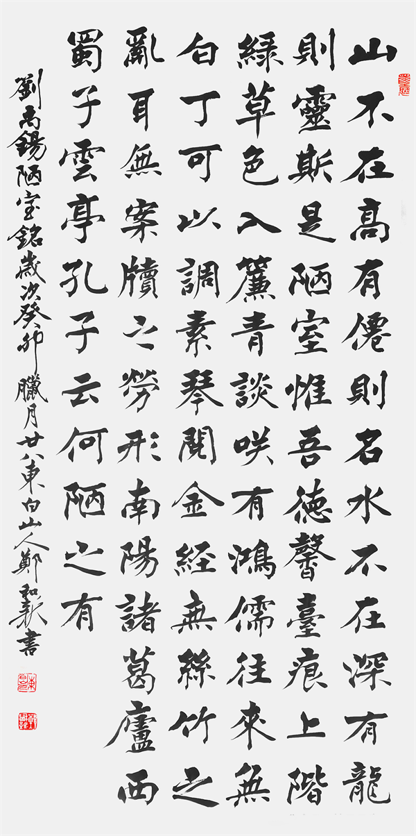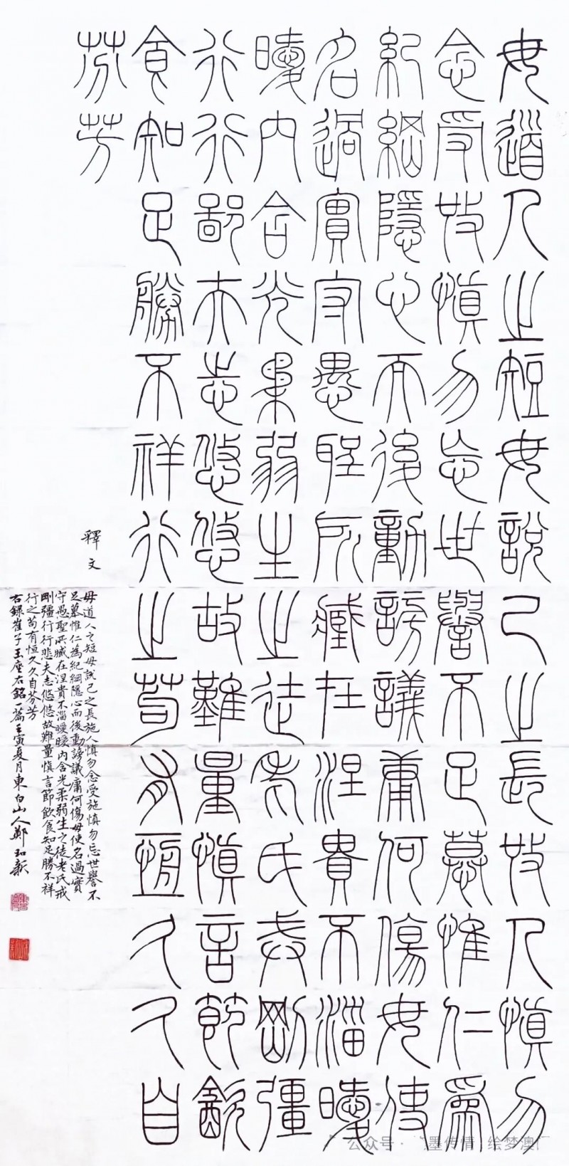 而在一些隶篆书法和小楷书法的创作上,郑和新先生则又是能向我们展现出一种充满清正之气和高古之气的书风神采!其隶书以汉隶为取法根源,可见石门颂的舒展放纵,又可见古拙生动,是谓点画俯仰间不失蚕头燕尾,左挑右磔中不失中宫之正也。正所谓楷法无欺,而今日郑和新先生的小楷笔法之精绝,结体之精到,完全就是有达到了极高的创作水准。作中文征明之笔意可见深厚,用笔点画不激不厉,是能在简约中见清朗,更是能在规矩中书险绝,行间字距,恰到适宜,笔笔耐看,字字耐读,清气满乾坤的翰墨高誉,唯此方可堪也!