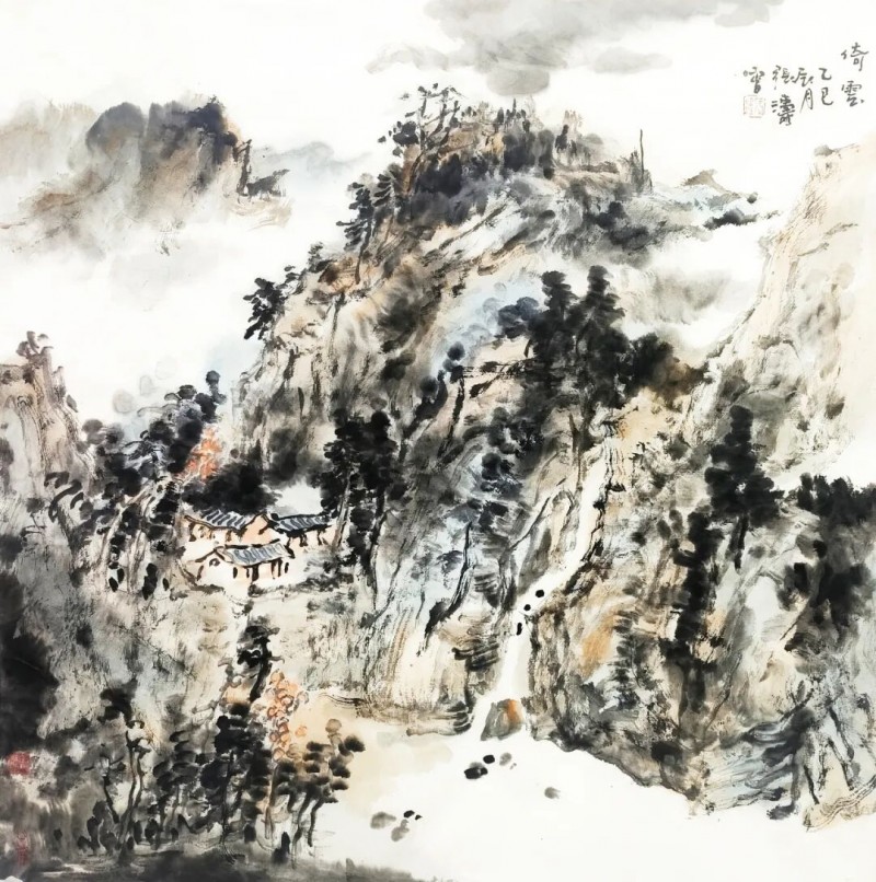 张涛在中国画的创作道路上已将近四十年,积累了丰富的学习和创作功力,尤其在山水画创作上取得了可观的成就,达到了相当高的艺术水平。他的画是从对古典传统绘画笔墨语汇的反复研究锤炼中,以元人笔意,运宋人丘壑,不断提纯笔墨,形成了自已独特的笔墨语言和画面构成,既高古又具现代感。他的画线条简洁凝重,墨色温润,笔墨交融点线交织而不相礙,体现出一种不激不厉的书写意味,画面充满着平和宁静,这正是中国画所需要的温文尔雅的文化精神。观他的画,找不到传统中某家某派的影子,但在笔墨点墨中透视出的生动气韵,皆是对传统营养吸取提练后的自我体现,这也正是张涛艺术风格的体现。