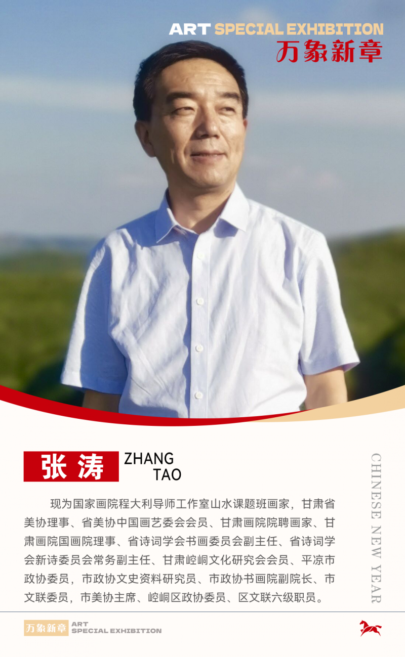 张涛,笔名雪樵,男,汉族,出生于1968年12月,籍贯甘肃崆峒,中共党员,大学本科学历。现为国家画院程大利导师工作室山水课题班画家,甘肃省美协理事、省美协中国画艺委会会员、甘肃画院院聘画家、甘肃画院国画院理事、省诗词学会书画委员会副主任、省诗词学会新诗委员会常务副主任、甘肃崆峒文化研究会会员、平凉市政协委员,市政协文史资料研究员、市政协书画院副院长、市文联委员,市美协主席、崆峒区政协委员、区文联六级职员。