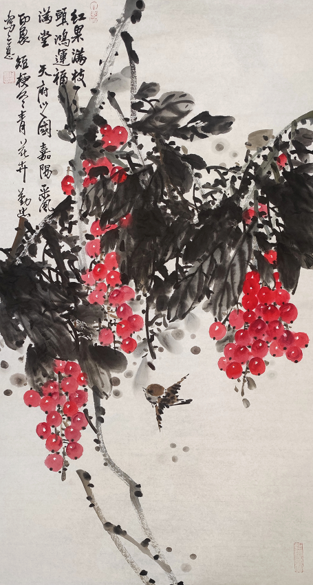 【红果满枝头 鸿运福满堂】国画写意花鸟作品,规格50cmx100cm三尺整张