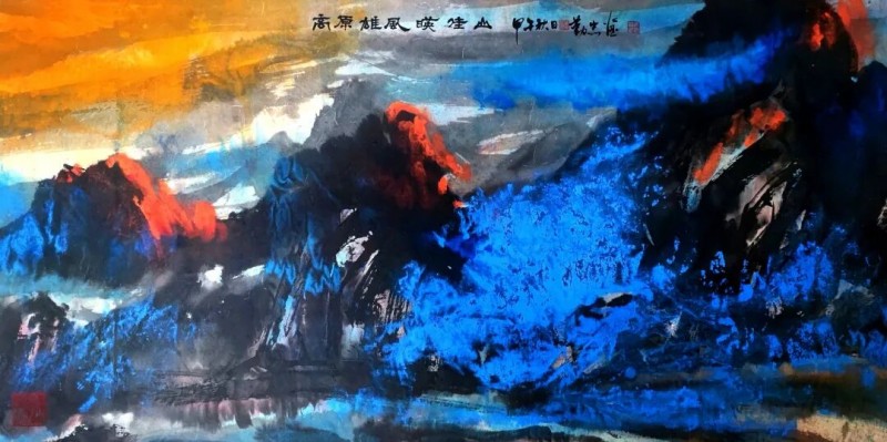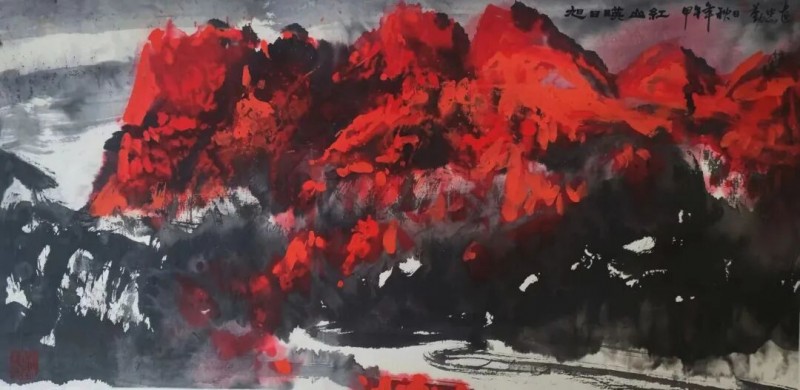 【旭日映山红】国画泼彩作品,规格:138cmx68cm四尺整张