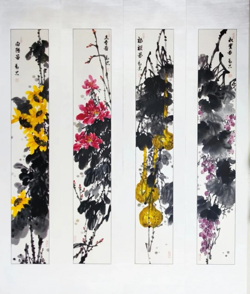 【向阳图】、【天香图】、【福禄图】、【秋实图】国画写意花鸟四条屏,规格:24cmx138cm四尺三开屏