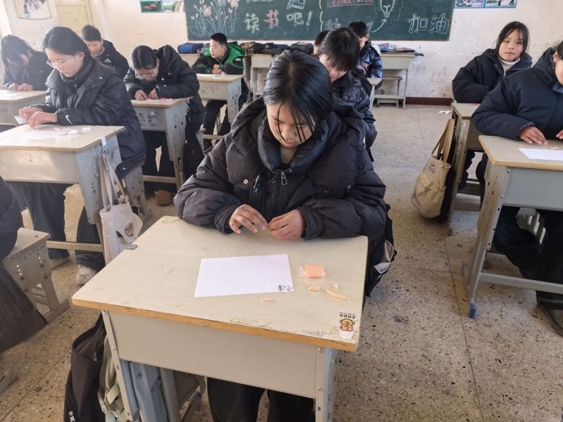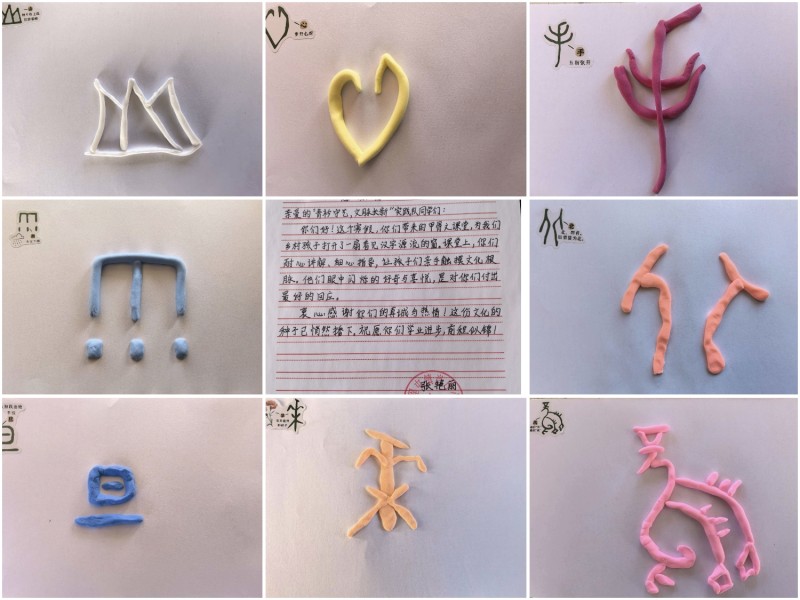 为加深学生对甲骨文形体结构与文化内涵的理解,实践队特别设计了“巧手捏甲骨”手工体验环节。队员们提前准备好彩色橡皮泥、字形卡片与制作工具,指导学生以小组形式动手捏制甲骨文字。孩子们在实践队员的帮助下,认真观察字形特点,耐心塑形、拼接、修饰,将平面的古老文字转化为立体可触的作品。在制作“福”“龙”“春”等吉祥字时,队员还融入相关文化典故与节日习俗的简要介绍,使文字学习与传统文化教育自然结合。孩子们手捧自己完成的橡皮泥甲骨文作品,成就感洋溢在脸上,纷纷表示“汉字原来这么有意思”“我想学写更多的古文字”。