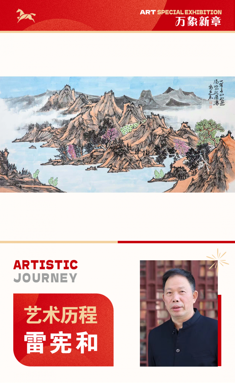 “雷宪和,自幼好艺,书艺诸精,投身军旅,眼界大开,其山水及书法在前人之基础上推陈出新,顺应时代审美取向作出了巨大努力,成绩菲然。他以书法入笔,融古今手法,借工笔及西画之元素,自成一帜。第十二届全国工笔画大展获奖作品《冬山如睡》为其代表,在探索新山水,特别是雪山表现的语境、笔墨符号,以及新山水的审美情趣达到了一个极致阶段。其参加全国全军书法作品大展取法唐宋上朔魏晋,艺术效果让人耳目一新。”