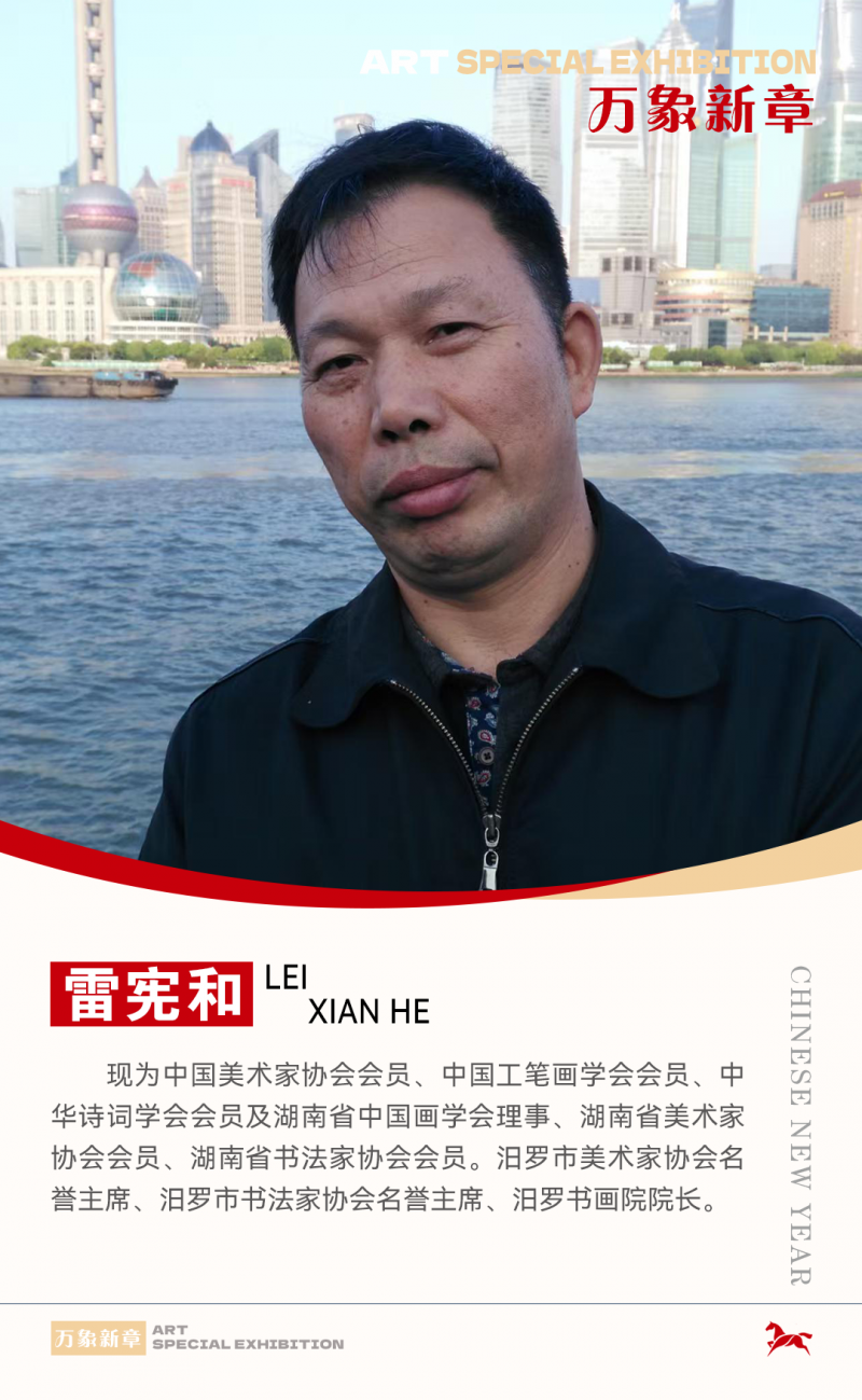 雷宪和,湖南汨罗人。现为,中国美术家协会会员、中国工笔画学会会员、中华诗词学会会员、湖南省中国画学会理事、湖南省美术家协会会员、湖南省书法家协会会员、汨罗市美术家协会名誉主席、汨罗市书法家协会名誉主席、汨罗书画院院长。曾修业于文化部现代工笔画院、中国工笔画学会青年名家王冠军工作室专题研修班,中国人民大学刘洪彪书法高研班。