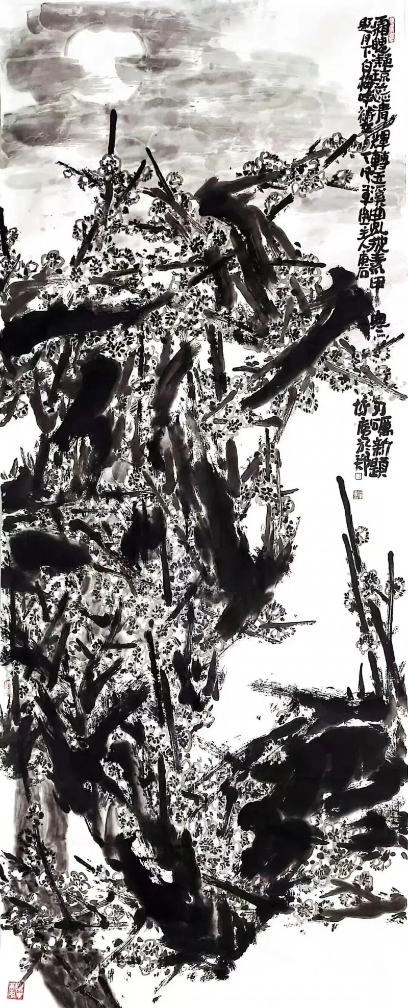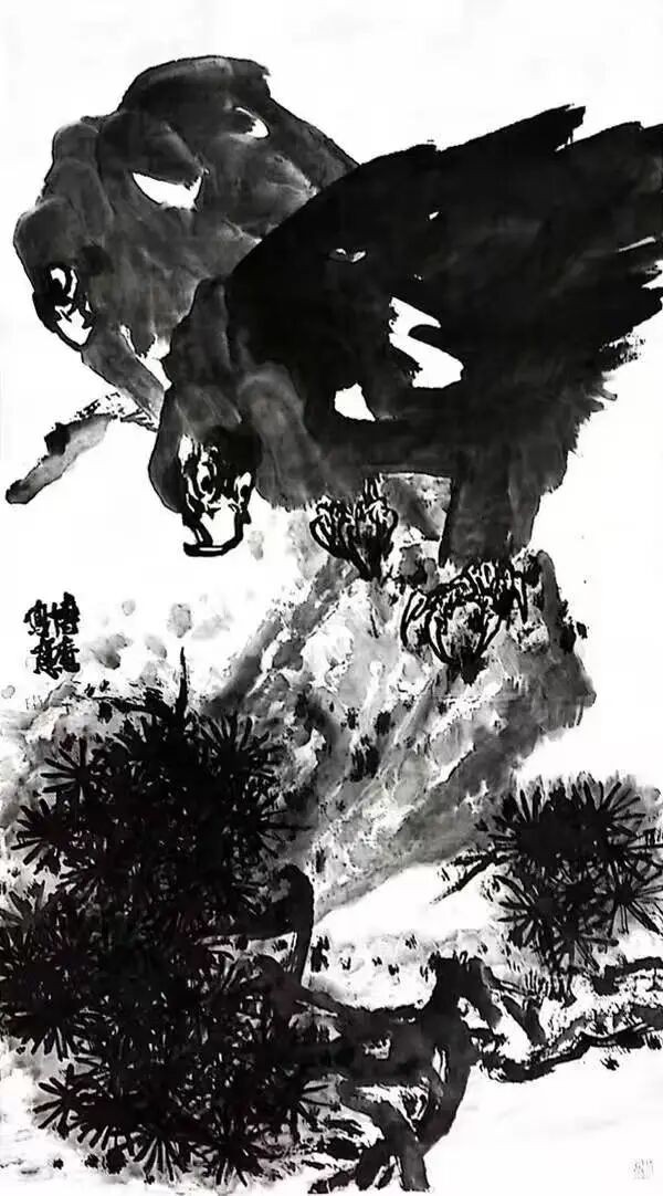 取篆隶之象,其境雄阔:他更从秦汉篆隶(如《石门颂》、汉阙铭文)的宏大结构与空间布局中汲取灵感。将金石文字中那种建筑般的稳定感与磅礴的开张气势,化入画面的构成与物象造型,使一石一木皆具纪念碑式的体量感与精神性,从而支撑起“大”的气象。