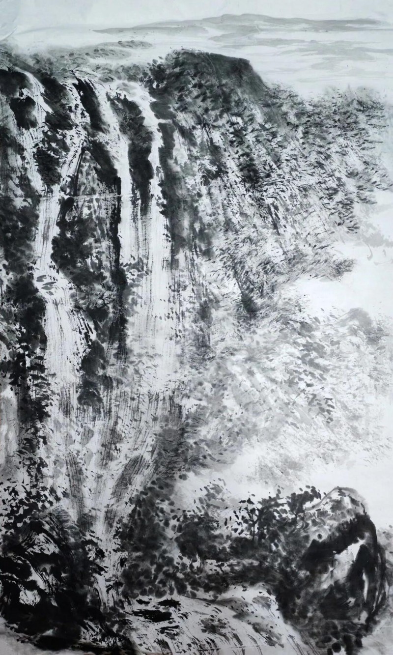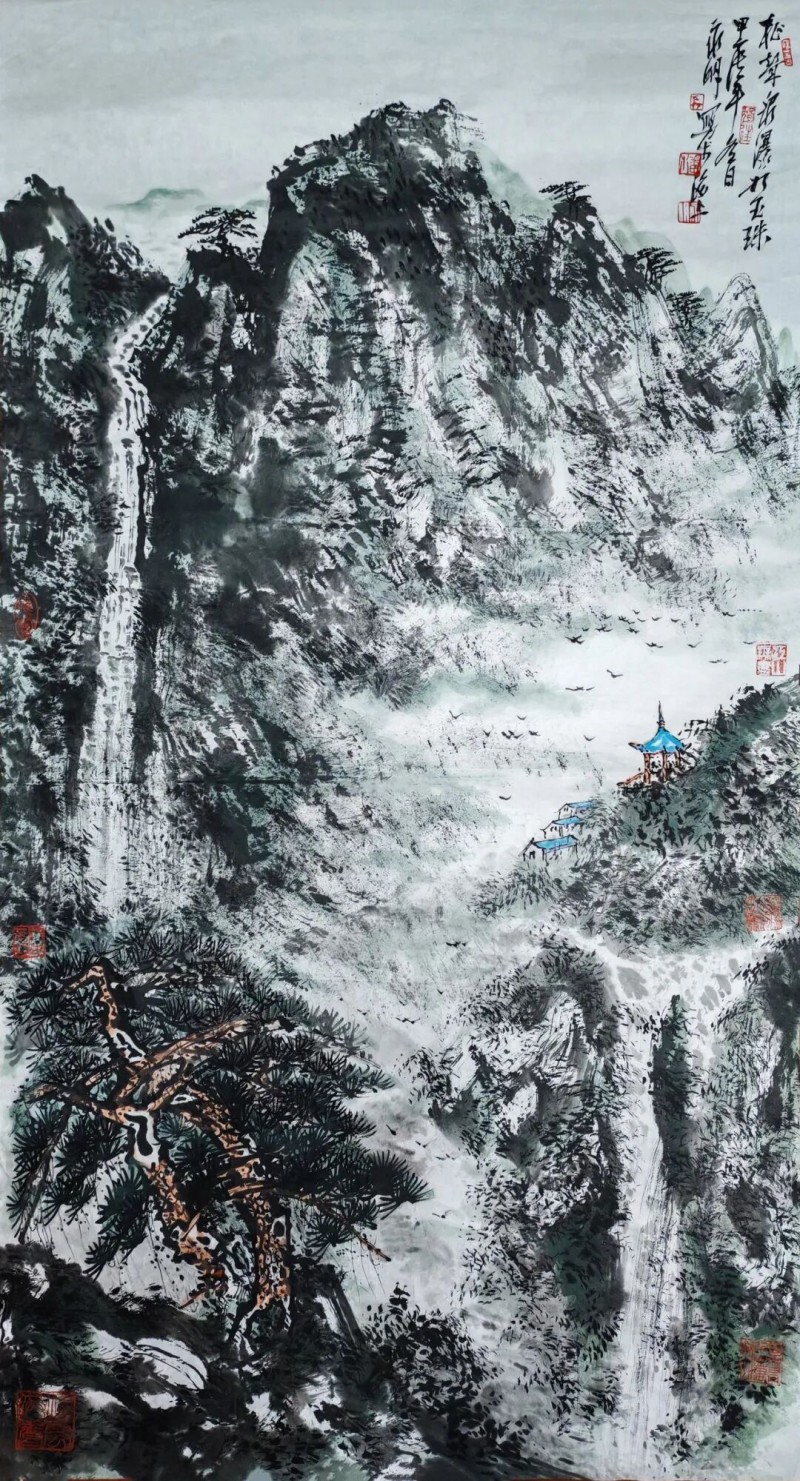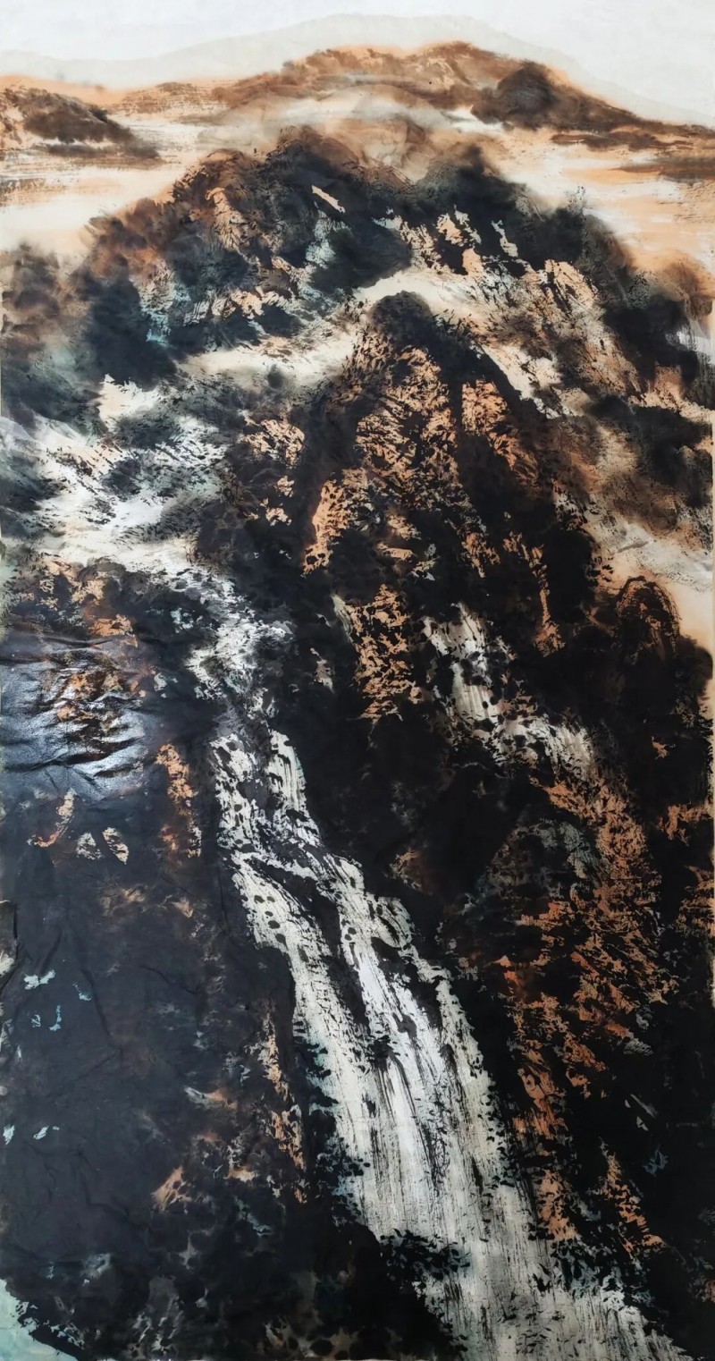 《泉声辩雨,雨润万山》中,细劲的游丝线条勾勒出漫天雨丝的诗意,浓重苍浑的山峦如轻烟薄雾萦绕,暗藏着生命繁衍的蓬勃气息;《万里风光万里船》以精到自然的勾云烘云之法,让流云兼具飘渺质感与回环曲折的音乐流动感;而《疑是银河落九天》则以一泓穿山而动的清水串联全局,山树交融间营造出迷离奇境,让观者身临其境、魂不守舍。他偏爱用粗壮曲线构画山峦,盘环曲折中尽显深沉凝重,每一笔墨都饱含着对山河的热爱,每一处构图都倾注着生命的情感。