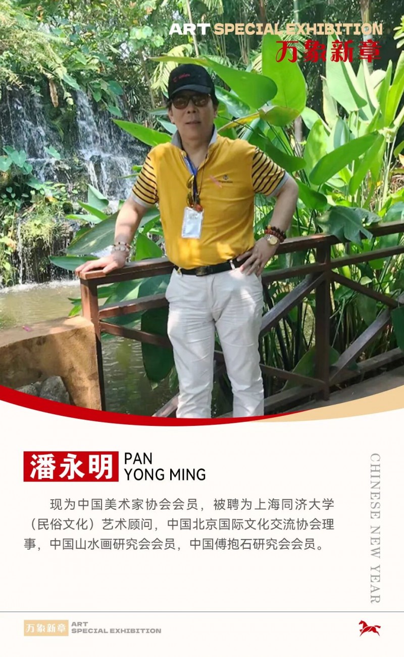 潘永明,1955年生,上海市人,号日月、南园、康乐,画室名碧均楼。现为中国美术家协会会员,被聘为上海同济大学(民俗文化)艺术顾问,中国北京国际文化交流协会理事,中国山水画研究会会员,中国傅抱石研究会会员。曾得到国画大师唐云、程十发器重,赞扬其山水画“很有精神”。“一代宗师”谢稚柳在察看潘永明画展时表示赞赏,并当场挥毫题词:“一代新风”。
