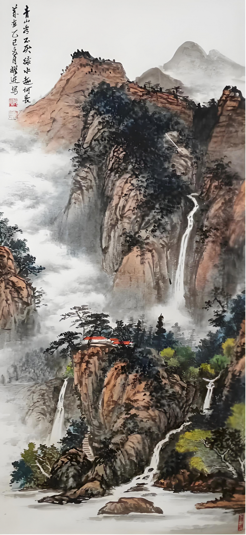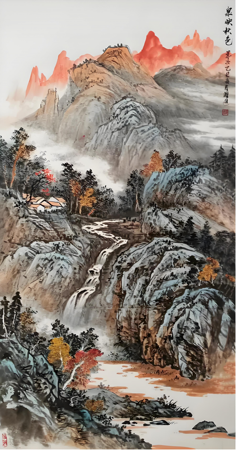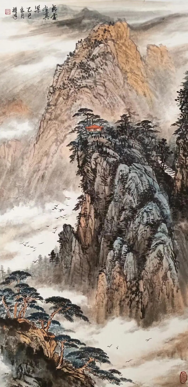 他笔下的山水,刻画细致,构思巧妙。宏见壮观,微现意趣。画面上崇山峻岭,峰峦叠嶂,云烟雾雨,亭阁瀑涌美不胜收。宛若音乐,飘荡出优美的旋律,使人陶醉。赏其画作,会令人不由自主的沉浸其中,心旷神怡,飘然入境。