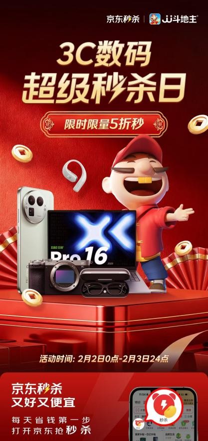 2月2日至2月3日,京东秒杀特别上线“3C数码超级秒杀日”活动,汇聚小米、讯飞、索尼(SONY)、联想、vivo等众多品牌的科技好物。活动期间,购买手机、电脑、数码产品,可享国家补贴与以旧换新补贴双重福利,最低5折起。消费者只需打开京东APP,点击“秒杀”即可一键直达活动会场,以半价抢购热门3C数码好物,畅享前沿科技体验。