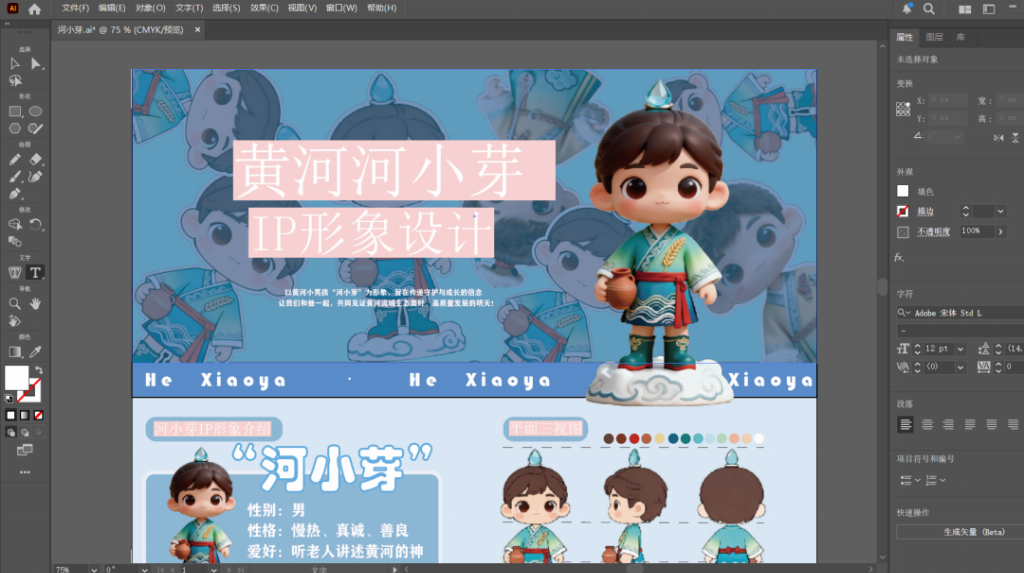 进入创作的中期,作品经历了从雏形到精致的艰辛蜕变。队长主持召开了多次线上线下结合的审稿会,对“河小芽”的每一处细节进行近乎严苛的审视。为了体现黄河文化的包容性,团队为角色设计了以“青绿”与“土黄”为主基调的服装,水纹装饰象征着母亲河的灵动,而那双祥云纹样的步履,则寓意着黄河文明步履不停。在创作最艰难的第五、六天,面对草稿辨识度不足的问题,队长带领大家推倒重来,重新定义了河小芽手中的仰韶文化陶罐,将其作为收集黄河智慧的载体,赋予了形象更深层的叙事意义。