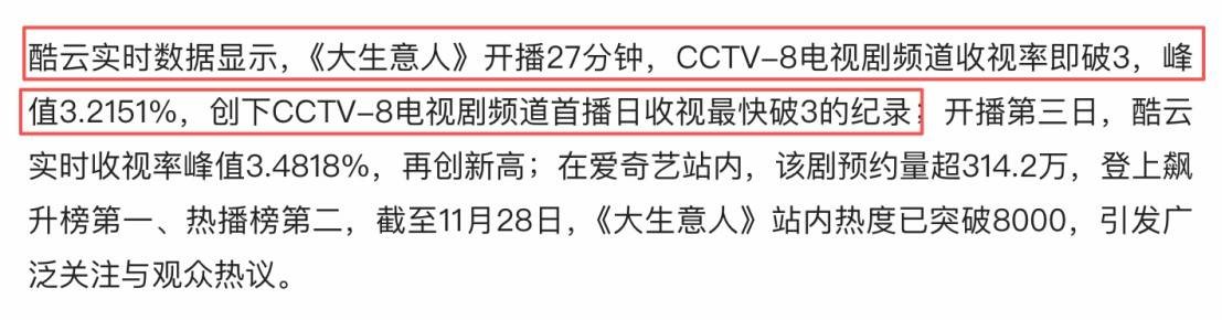 也让《大生意人》一经播出,便创下央八收视率最快破三的纪录。