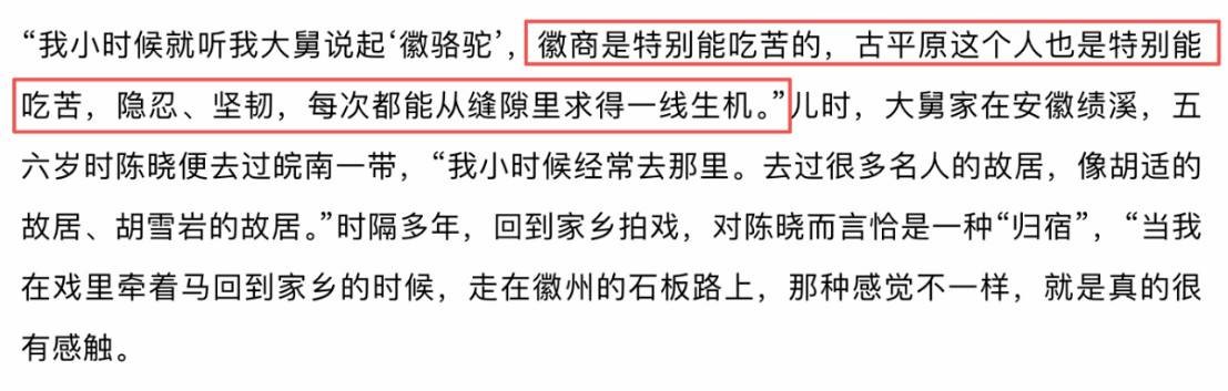 这份在陈晓职业生涯里随处可见的、肯为角色豁出去的劲头,体现在他演戏从来不只是背台词、做表情,他会深度潜入角色的灵魂,思考其成长轨迹与生存状态,并让自己的身心都向那个状态靠拢。在《大生意人》拍摄期间,他再度暴瘦的形象引发关注。对此,他只是淡淡解释了对角色古平原(一位徽商)的理解:徽商能吃苦、隐忍、坚韧。因此,一个清瘦、精干的外形,便是他交给角色的第一份答卷。