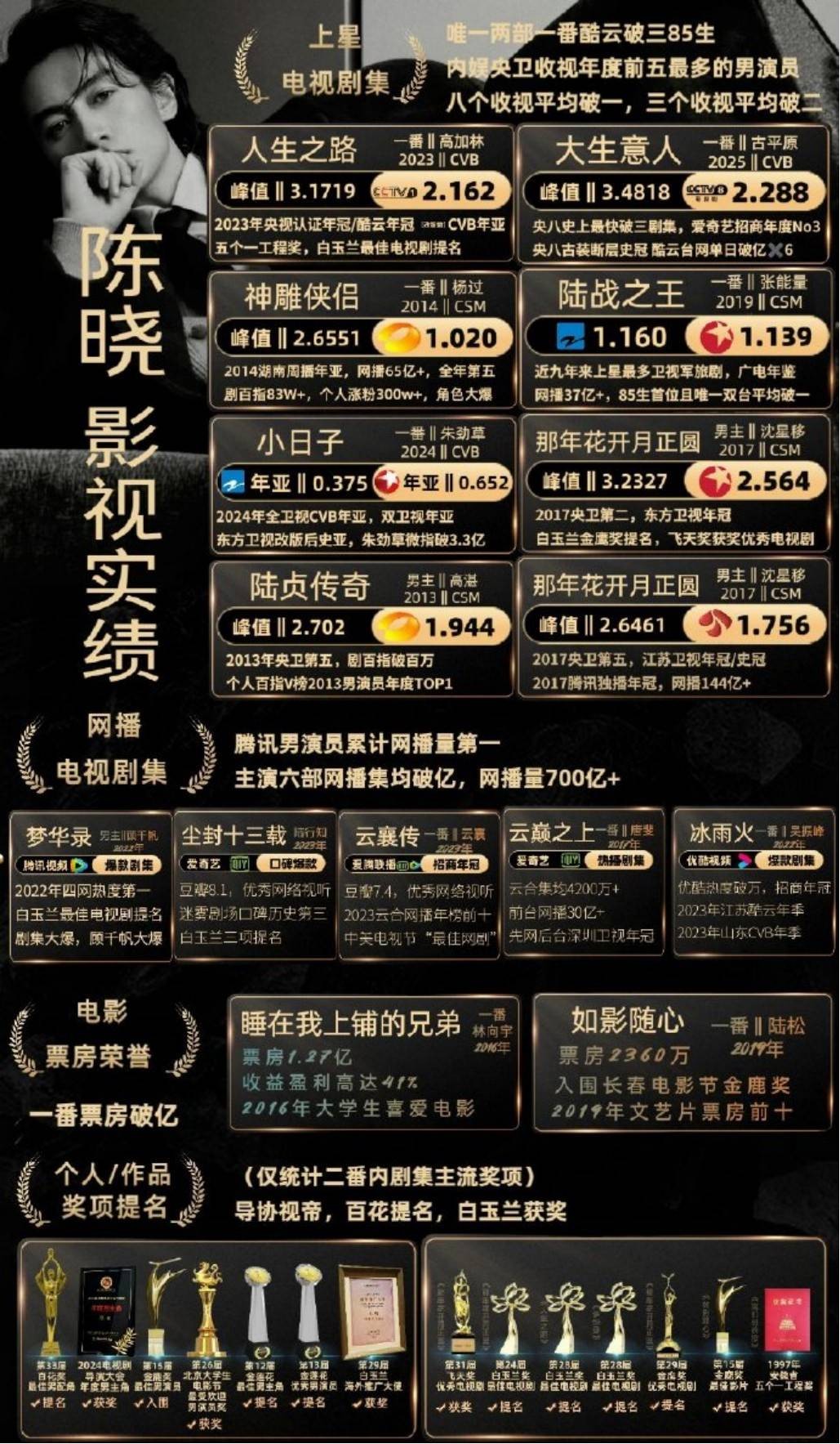 回看陈晓的成绩单,堪称华丽:他是唯一拥有两部一番酷云收视破三作品的85生,是内娱在央视和卫视年度收视前五榜单中出现次数最多的男演员之一,手握导演协会颁发的年度男演员奖项,提名过百花奖、华鼎奖,担任白玉兰奖推广大使,更是腾讯平台男演员累计网播量第一人,主演剧集网播总量突破700亿,其中六部集均播放量过亿……