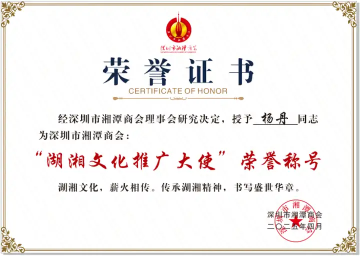 杨丹被深圳湘潭商会授予“湖湘文化推广大使” / 图片来源:受访者提供