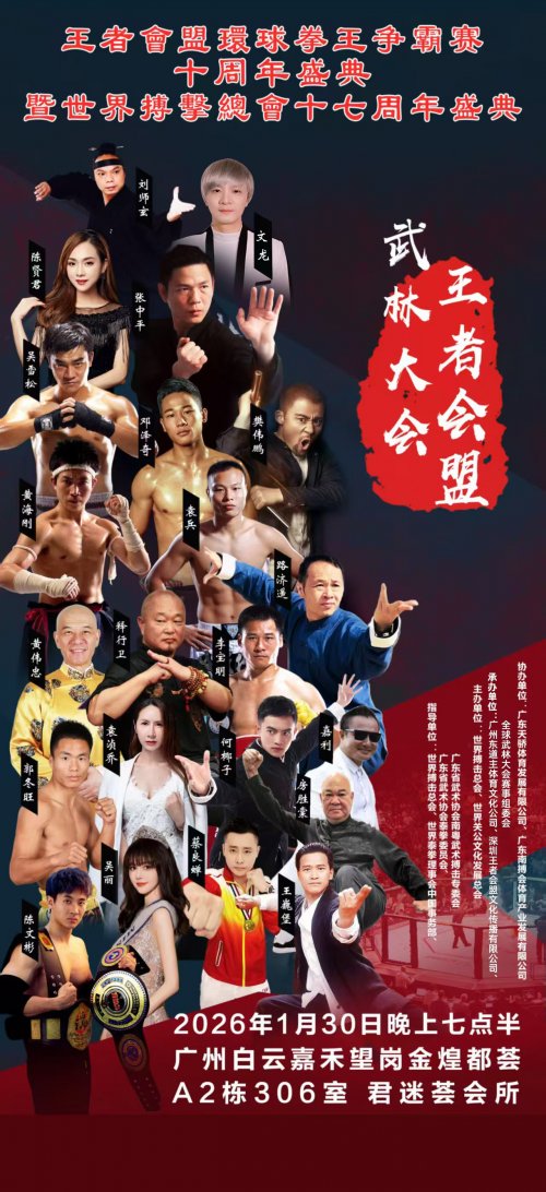 江湖不远,英雄必赴。擂台上见真章,宴席中叙豪情——2026年1月30日,广州君迷荟会所,让我们共赴这场拳风激荡之宴、肝胆相照之约、荣耀共鸣之典,共铸武林新辉煌!
