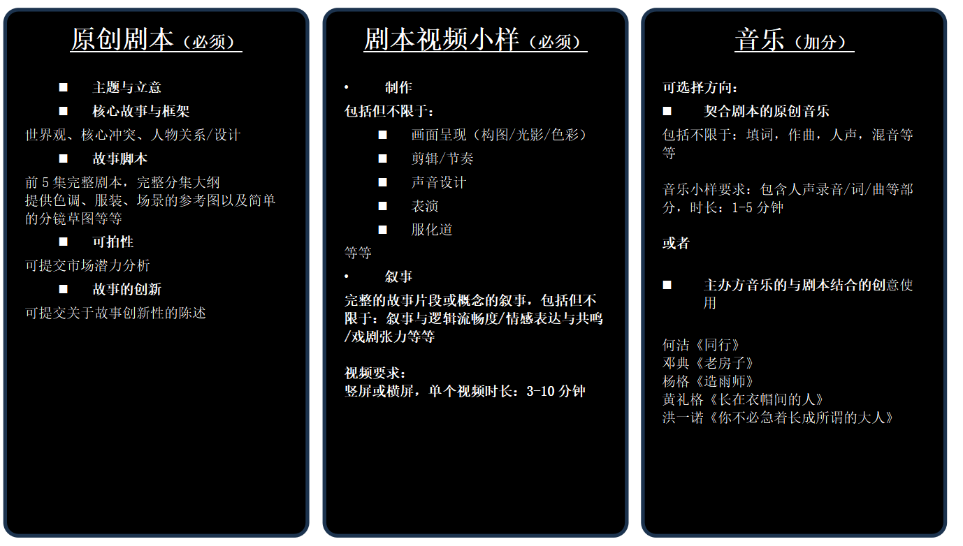 优秀作品更可获得 落地投资拍摄与发行机会 / 主办方相关活动邀请与展示机会 / 主办方官方平台作品宣传等,助力创想者梦想成真!