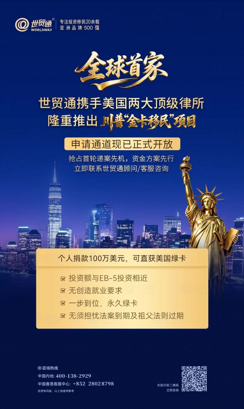 此外,川普金卡移民项目正式开放申请,世贸通已率先启动金卡受理服务,助力申请人高效推进申请进程,把握关键时间窗口。