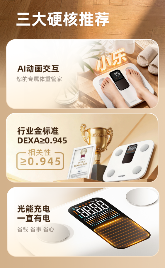 从当前智能体脂秤行业发展现状来看,“续航焦虑”“数据模糊”“功能单一” 仍是制约行业升级的三大核心痛点 —— 电商平台数据显示,近 60% 的体脂秤差评集中于 “频繁换电池 / 充电”,超 40% 用户反馈 “数据不准、参考价值低”,而 “测完仅显数字,无后续健康指导” 的问题更让多数产品沦为 “一次性监测工具”。乐福此次推出的光能体脂秤,恰好以针对性创新为行业提供了破局思路。