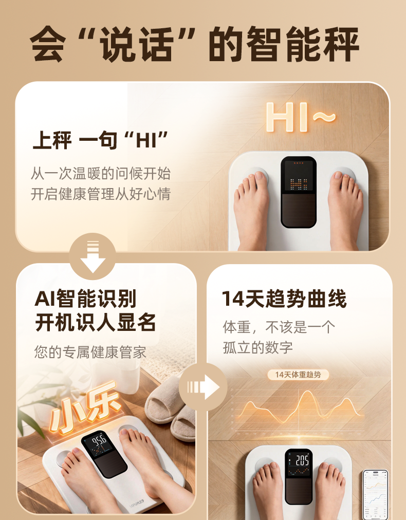 1、AI 动画交互技术:创新采用 AI 动画交互界面,用户可根据自身需求自定义健康数据展示方式,直观呈现体重、体脂率、肌肉量等关键健康指标,让健康管理更加个性化、可视化。