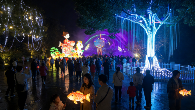 活动的文化根基源于国家级非物质文化遗产——自贡彩灯。所有灯组均由自贡匠人手工扎制,将“凤栖南山”等传统吉祥图案以长达20米的巨型灯组形式呈现,细节精美,栩栩如生。在传承非遗技艺的同时,项目引入现代激光投影与互动传感技术,构建起一个规模宏大、体验丰富的光影世界。整体规划包含6大主题区域,让游客穿梭于风格各异的光影叙事中;设置有11处由顶尖团队打造的艺术光影装置,每一处都是独特的拍照打卡背景;更融合了超过60项光影互动体验,从地面到空中,光影随脚步流转,昼夜皆景,为游客带来从传统美学到数字沉浸的完整之旅。