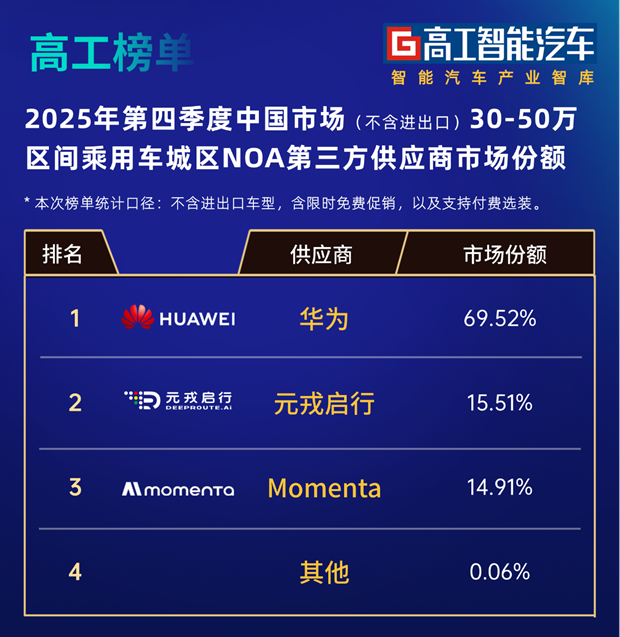 数据来源:《2025年第四季度中国市场(不含进出口)30-50万价格区间乘用车城区NOA第三方供应商市场份额榜单》