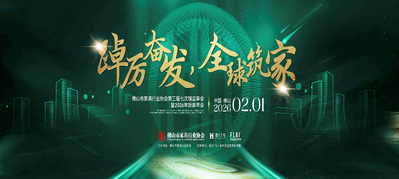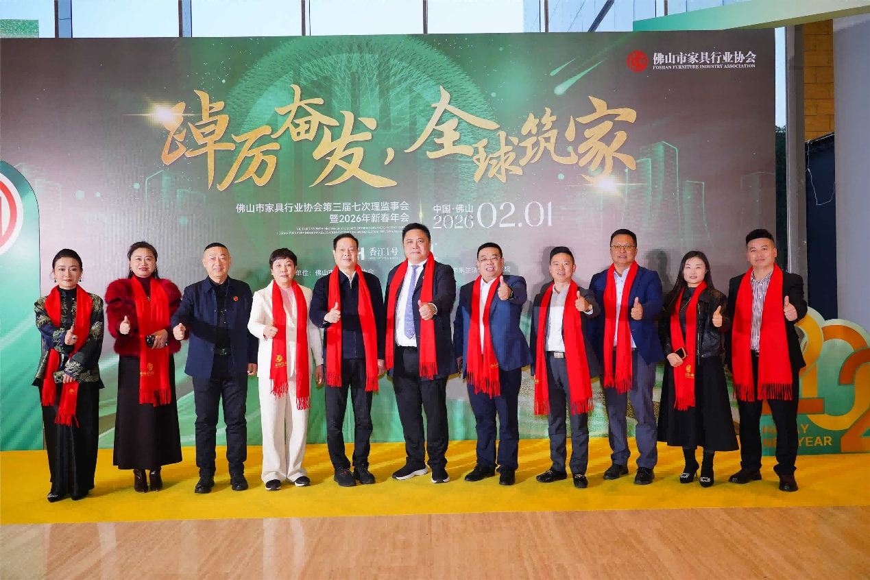 2026年2月1日,佛山市家具行业协会第三届七次理监事会暨2026新春年会在佛山罗浮宫索菲特酒店盛大启幕,本次盛会以“踔厉奋发,全球筑家”为主题,汇聚政府部门、各界商协会、行业重点企业及会员单位代表共话发展。