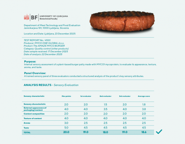 其中MYCO Juicy Burger(牛肉口味)已在斯洛文尼亚卢布尔雅那大学食品科学与技术系下属感官评测实验室进行专业、客观、可量化的产品品尝与评价。产品在综合评测中获得18.6分的高分评价(满分20分),具备进入主流商超资质。