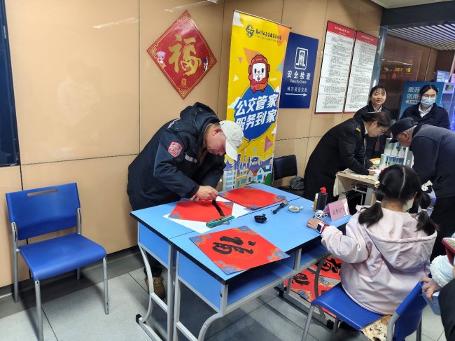 活动现场墨香与年味交织相融,一派喜气洋洋的新春景象。公交书法爱好者凝神运笔、挥毫泼墨,一笔一划间尽显心意,一幅幅笔力遒劲、红彤彤的“福”字跃然纸上,承载着马年大吉、平安顺遂的美好期许。地铁工作人员与公交管家身着整齐工装,面带笑容、默契配合,将这些饱含温情的墨宝免费赠予过往乘客,一句句“新春快乐”“马年吉祥”的问候暖意入心,收到祝福的市民们笑意盈盈、满心欢喜,不少人当场拿起“福”字合影留念,定格这份冬日里的温暖惊喜。