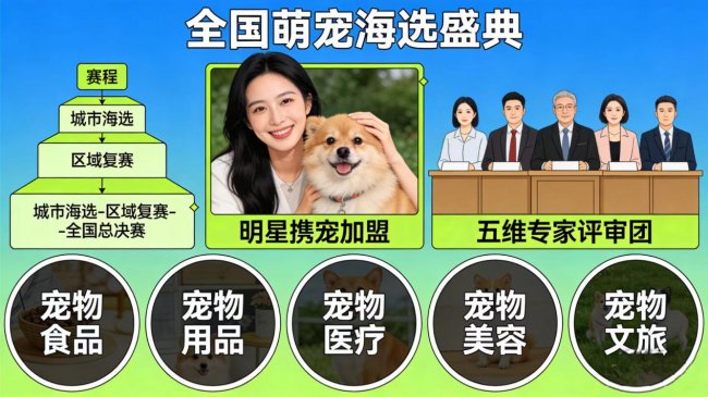 本次海选将采用 “城市地面海选-集中初赛-封闭式主题复赛-总决赛盛典” 的完整赛程。海选将覆盖全国多个重点城市,为普通养宠家庭提供零门槛的展示舞台。尤为引人关注的是,在封闭式复赛阶段,将有多位 “明星与它的宠物” 作为特别嘉宾参与互动与比拼,为赛事注入强大影响力与观赏性。