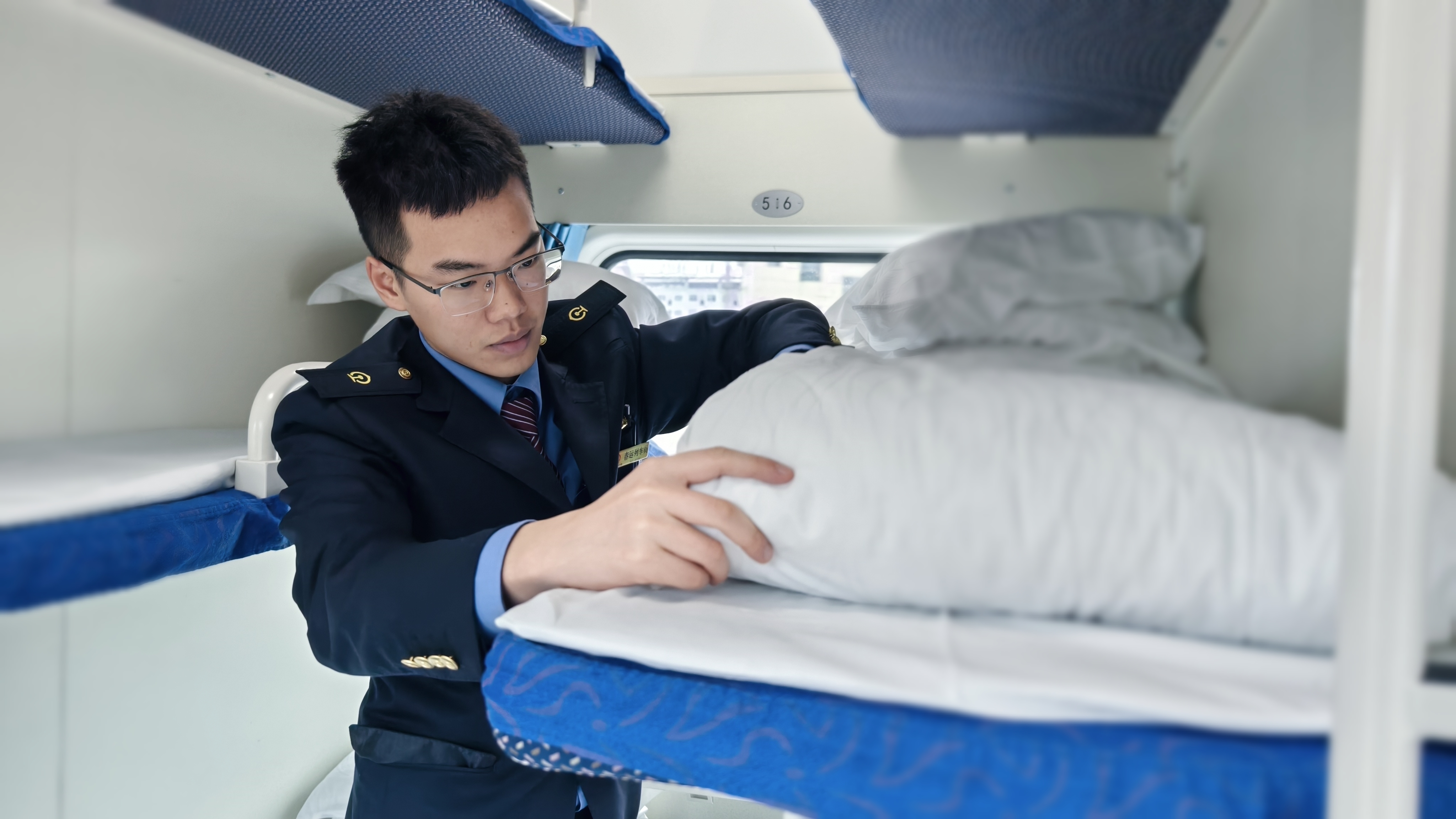 值乘途中,青年乘务员们的暖心服务无处不在:反复提醒旅客注意用水、行李放置安全,提前唤醒到站熟睡旅客防止越站,细心为老年旅客协调相邻铺位,将乘务备品统一定位、卧具叠成方块被,用专业与贴心诠释着青春担当。