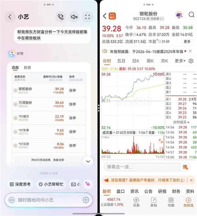 得益于双折叠屏手机开阔的视野和独特的双屏交互,投资者可以通过小艺语音助手唤起“妙想智能体”进行股票查询,轻松实现“左侧问股、右侧交易”的便捷操作。例如,用户只需对小艺说“用东方财富帮我看一下今天涨停股集中在哪些板块”,小艺便会通过智能体列出相关板块及涨停情况;点击任意板块,右侧屏幕即可直接跳转至该板块的行情页面,而左侧屏幕仍可继续交互,供投资者进一步提问。这样一来,以往需要在多个设备或应用间反复切换的操作,如今只需在掌上方寸之间轻触屏幕,便能从容实现边查询边交易的一体化体验。