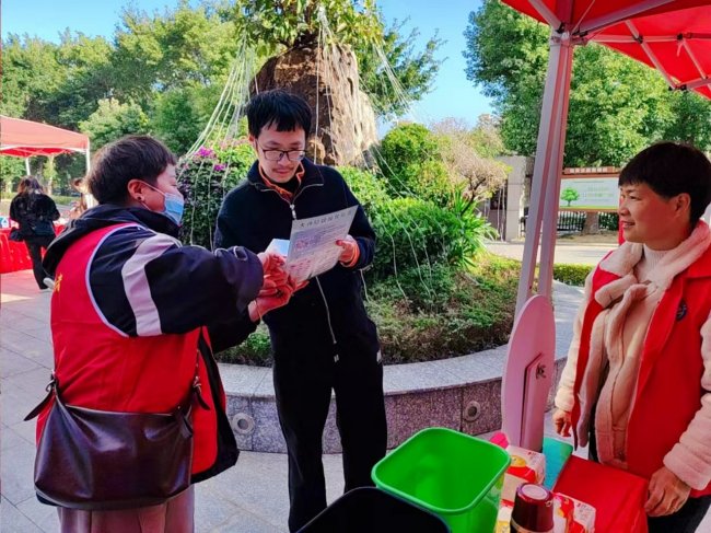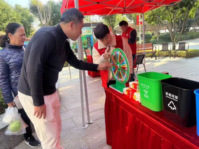 主会场内,一场“沉浸式垃圾分类体验会”热闹开场。不同于传统宣讲,志愿者们通过“垃圾分类有奖竞答赛”升级为闯关模式,从基础分类知识到冷门误区辨析,层层递进的题目激发了市民的参与热情,通关者不仅能领取环保布袋、可降解垃圾袋,还能兑换定制的分类指南手册。创意打卡区则融入新春元素,红灯笼、春联背景与垃圾分类标语巧妙结合,市民手持“我是分类践行者”手牌拍照分享,让绿色理念在社交圈广泛传播,相关工作人员一同参与体验,与市民亲切交流分类心得,让“新春新风尚,分类我先行”的口号深入人心。