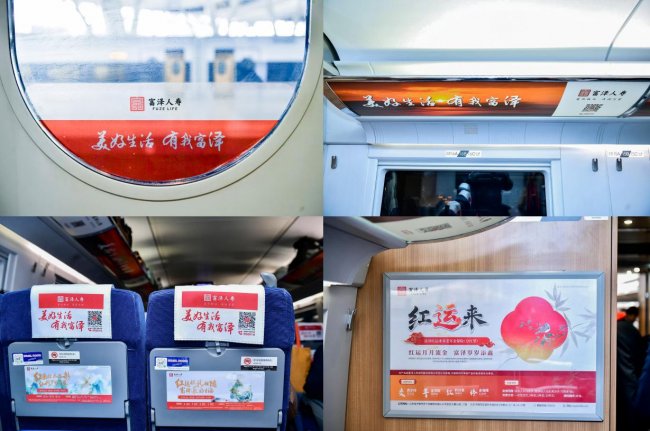 品牌专列打造了丰富的视觉传播场景,除了车身两侧的品牌口号外,车厢内部还通过头片、桌贴、品牌天幕、海报、LED滚动屏等多点位传播媒体,全方位展现富泽人寿品牌形象、主力产品等内容,构建了仪式感和体验感俱佳的移动品牌展厅。