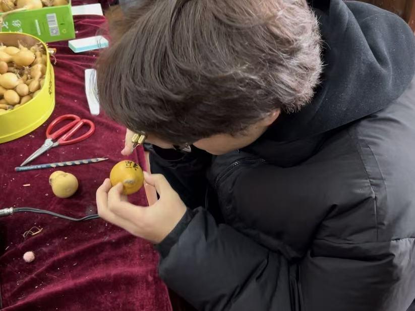 风筝扎糊绘放四艺精妙,竹骨为架、彩纸为衣,经绘染勾勒便具神韵;葫芦烙书以烙铁为笔,高温烫绘山水花鸟,高密剪纸以镂空技法见长,民俗节庆题材鲜活。潍坊刺绣针法细腻,平针铺色、打籽点缀,绣品多用于服饰鞋帽,兼具审美与实用。木版年画经绘稿、刻版、套印多道工序,色彩浓艳寓意吉祥;核雕在方寸果核上精雕细琢,人物眉眼、亭台楼阁栩栩如生。在传承人指导下体验烙书勾线、剪纸起稿,认真记录技艺要点。在指尖互动中感受非遗魅力,用实际行动传承匠心,让古老技艺在新生代中焕发新活力。