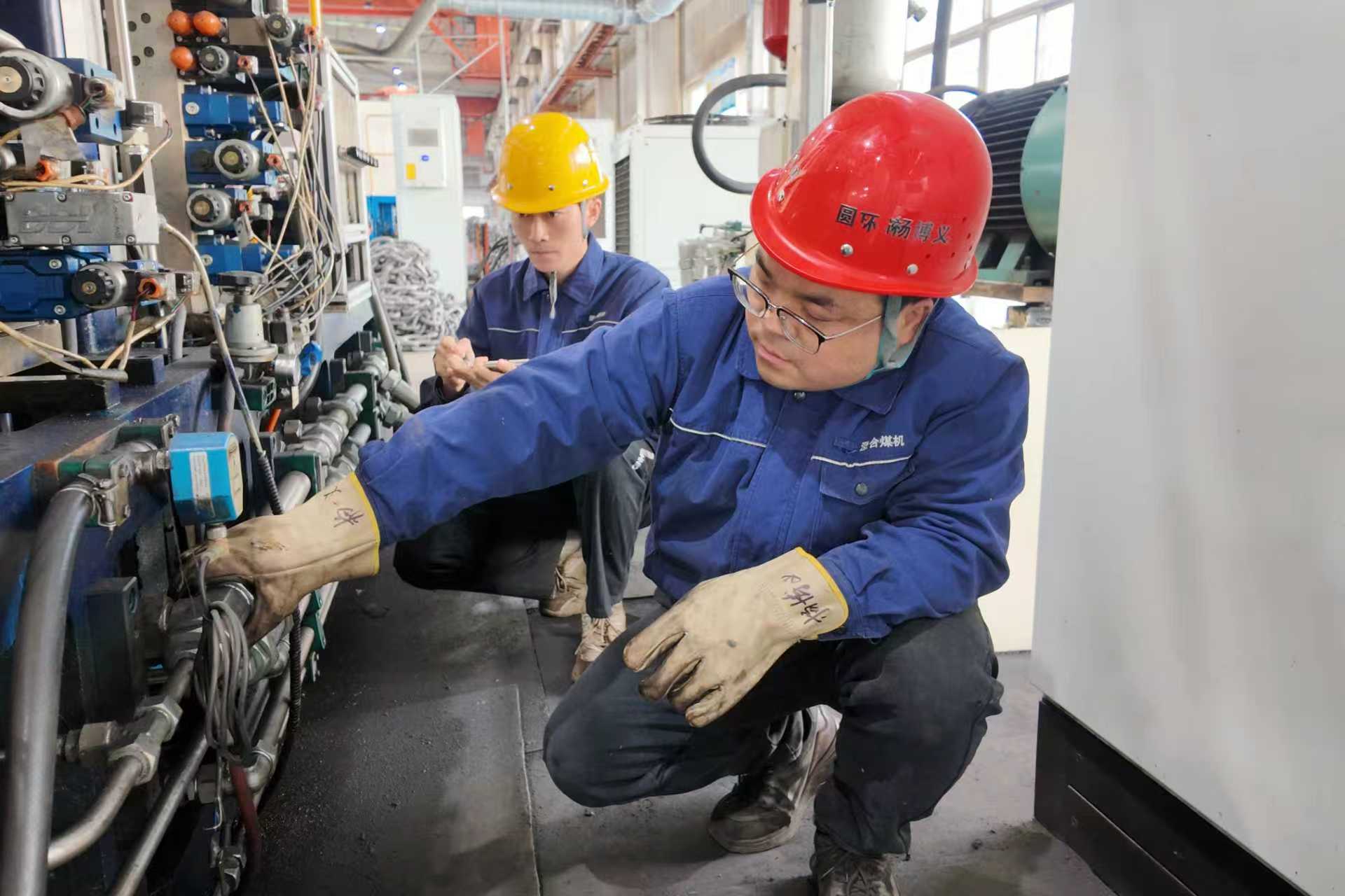 图为该公司圆环链车间职工检查全自动全液压金属圆环链闪光对焊机油路防冻情况