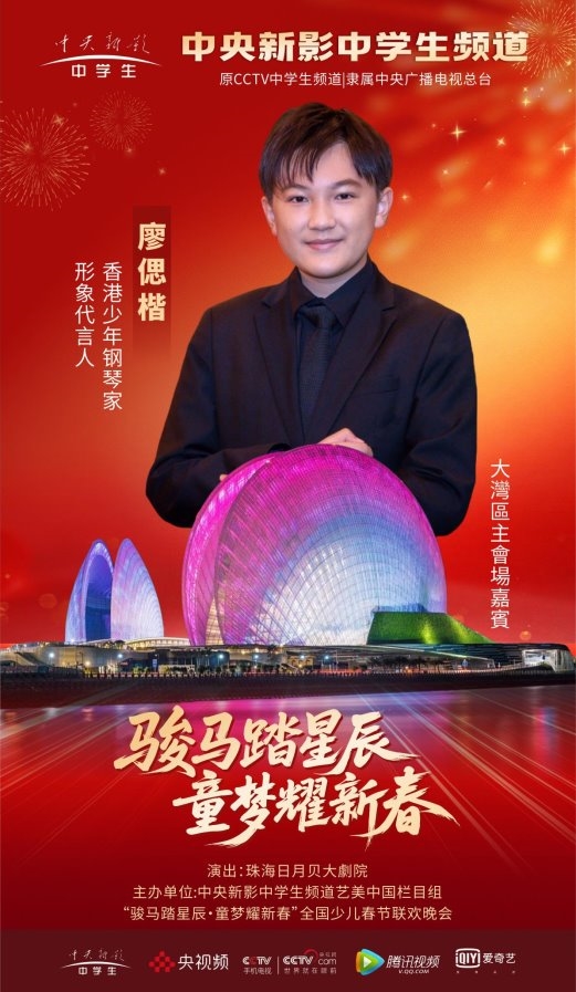 本次全国少儿春节联欢晚会由中央新影中学生频道艺美中国栏目组主办,紧扣“骏马踏星辰,童梦耀新春”主题,深度诠释粤港澳大湾区共贺新春、艺术同心的深厚底蕴。录制前十天,廖偲楷收到晚会导演组的邀请——希望通过香港少年的艺术视角,共同展现中华年味儿的艺术魅力。