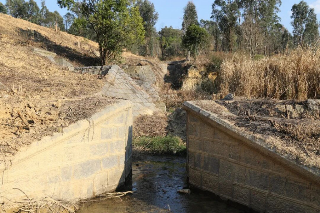 雷明川是一位土生土长的稼依人,儿时记忆中这里曾有一座水坝遗址。他将这一线索提供给砚山县文化和旅游局后,普查队立即前往实地调查。尽管水坝已废弃多年,坝堤草木丛生,但经过仔细勘查,其整体结构之完整仍令人惊叹。坝体雄姿犹存,溢洪道、排水涵洞等关键设施保存完好,尤以当时工匠精心垒砌的石构工艺为著。一块块石材咬合紧密,历经风雨而巍然不动,静默诉说着往昔的智慧与匠心。