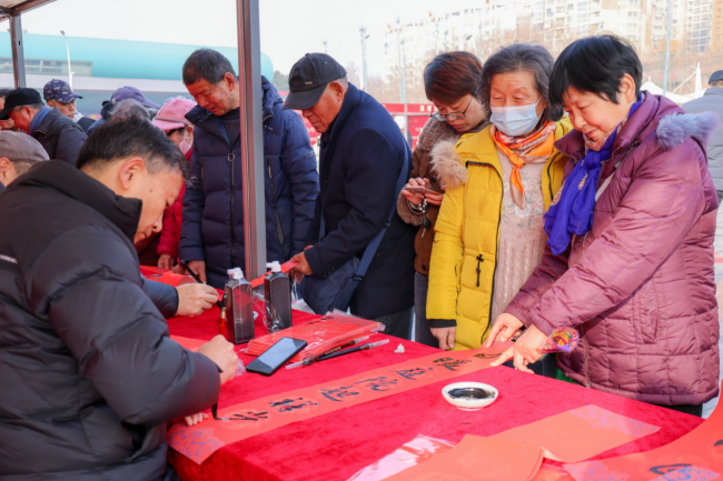 互动体验区内,墨香四溢。蚌埠市的书法家们挥毫泼墨,“龙年大吉”“福满珠城”等吉祥话语跃然纸上,市民排起长队等候定制免费春联。拿到手写春联的市民脸上乐开了花,红纸黑字间流淌着最传统的中国年味儿。