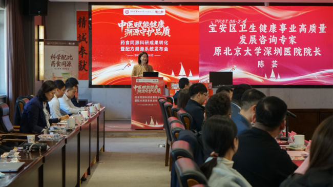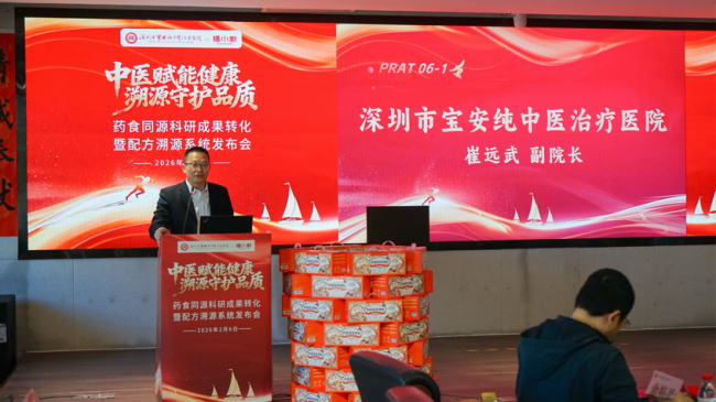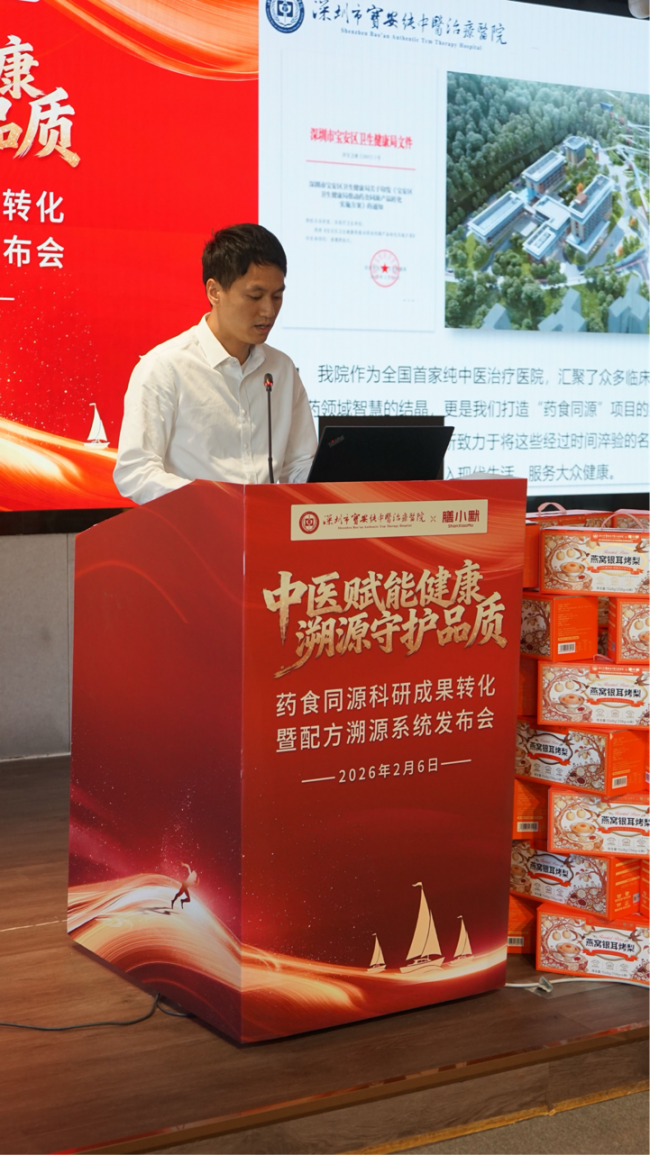 为深入贯彻落实国家中医药传承创新发展战略,积极推进中医药强市、健康深圳建设部署要求,切实推动药食同源科研成果落地见效,强化中医药产品品质管控,保障群众健康权益,2月6日,深圳市宝安纯中医治疗医院在门诊楼八楼大会议室举行“中医赋能健康 溯源守护品质”药食同源科研成果转化暨配方溯源系统发布会。活动聚焦科研成果转化、品质溯源保障、院企协同发展三大核心,进一步拓宽中医药服务路径,助力宝安区中医药事业高质量发展。