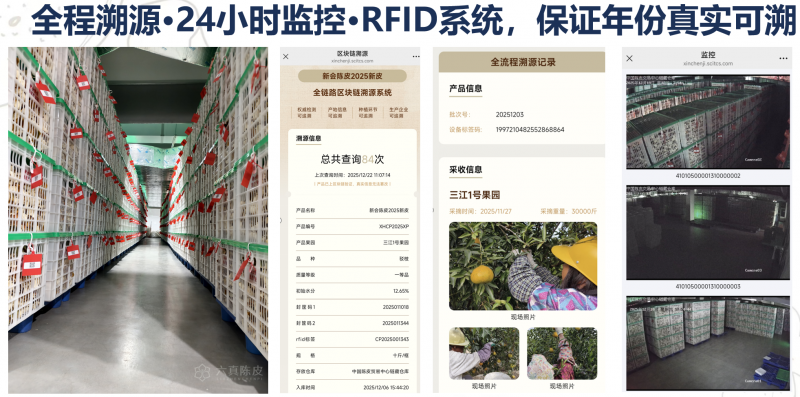 真年份:依托标准化智能干仓陈化中心,结合RFID芯片追踪系统与24小时环境监控系统,实现每一批陈皮的入库时间、陈化环境数据全记录,年份真实可溯,杜绝“人工催陈”;