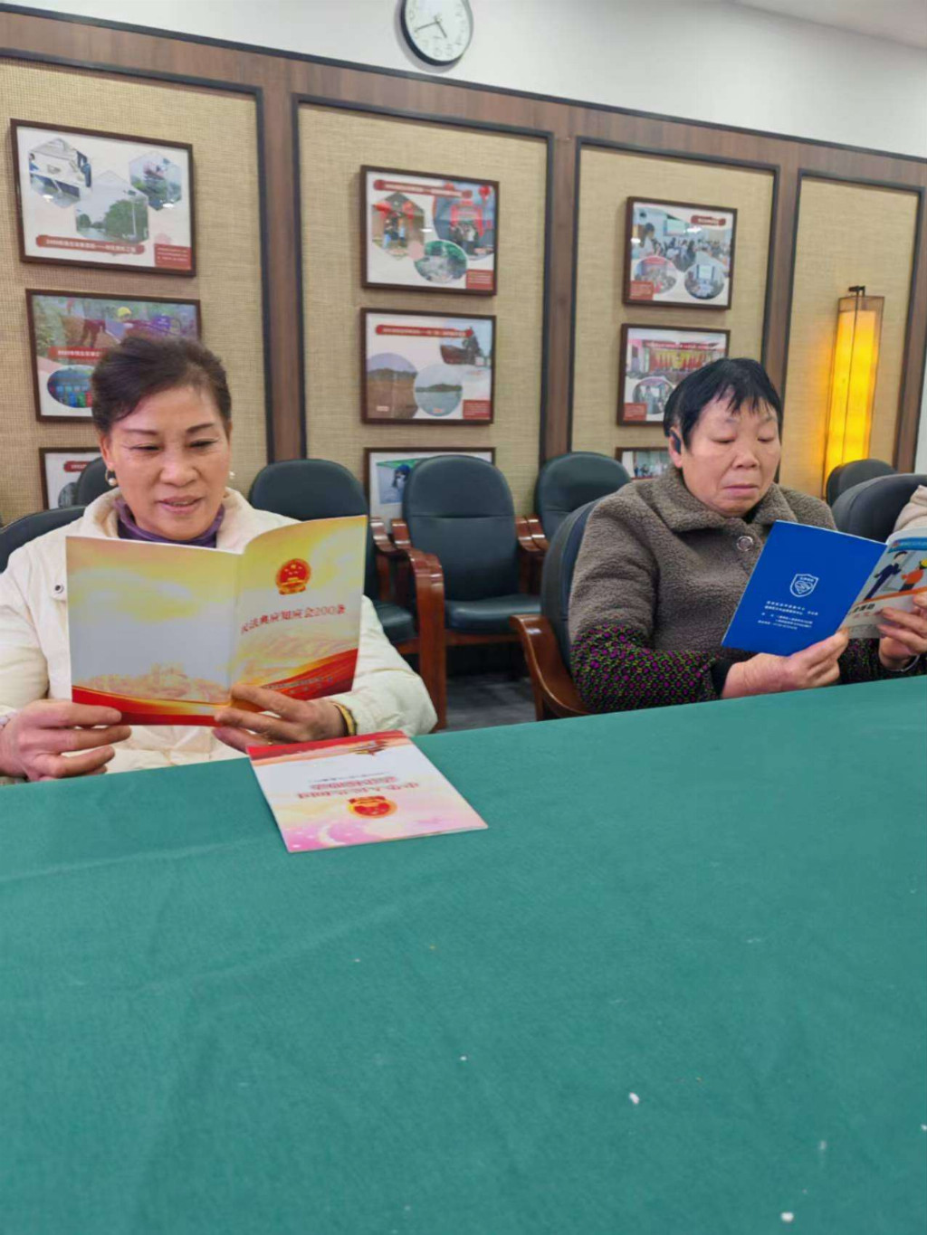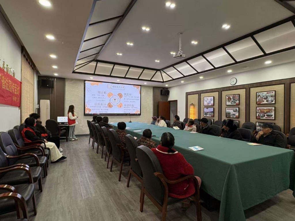 活动伊始,宣讲人员何思璇率先点明活动主旨:针对村民在务工就业、邻里相处、征地拆迁等场景中易遇到的法律难题,用通俗语言普及法律知识、明确维权路径,帮助大家从“不懂法”变为“懂法、用法”,学会用法律武器守护自身合法权益。话音刚落,志愿者与司法局工作人员便有序向现场村民分发普法宣传册,不少村民拿到资料后当场坐下认真翻阅,遇到晦涩的条款或疑问,便主动上前向工作人员请教,工作人员耐心细致地逐一拆解解答,现场学习氛围浓厚而热烈。