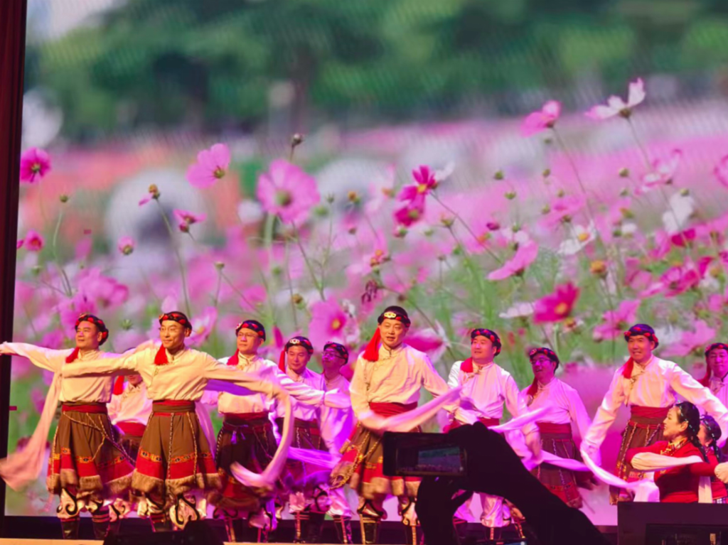 夜幕下的河湟民俗广场,一场藏族歌舞演出正在进行。舞台背景是盛放的格桑花海,舞者身着白色交领上衣与镶边藏裙,手持哈达踏歌起舞。锅庄舞的热烈舞步与弦子舞的柔美摆袖交织,队员们受邀加入行列,在整齐的节奏中感受藏族同胞的热情。这场演出不仅是民俗展演,更是黄河流域各族人民共享文化盛宴的生动写照。