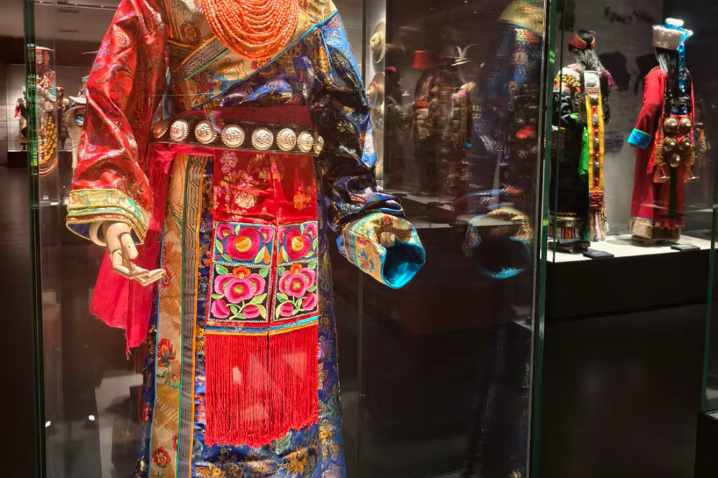 在青海藏文化博物院,团队被一件河湟藏族女性盛装吸引。这件藏袍以红、蓝绸缎为底,裙身刺绣的牡丹纹样带着中原审美印记,腰间的银饰腰带则延续着游牧文化的实用传统。讲解员介绍,河湟服饰是多民族文化碰撞的产物,纹样里藏着黄河沿岸各族人民交往交流的密码。成员们用镜头定格细节,将“文化共生”的感悟融入调研报告。