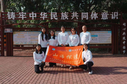 图为“山海探遗”实践队在小坝村“民族共同体”栏坊前的合照 摄影:连键刚