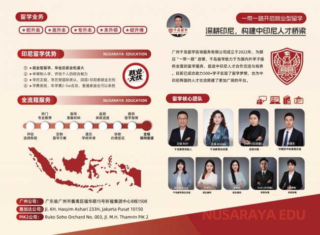 依托深耕中印尼教育交流领域多年的深厚积淀,千岛教育凭借三大核心优势,持续为两国教育人才双向输送赋能:一是资源优势突出,深耕印尼教育市场,与印尼总统大学等顶尖院校建立长期稳固的战略合作关系,同时联动华忆教育、五邑大学等国内优质教育主体,实现中外教育资源高效整合;二是服务体系完善,构建了从生源筛选、课程衔接、签证办理,到海外生活适配、就业指导的一站式全链条服务,践行“诚信赋能、精准输送、全程护航”的服务理念,切实解决学子与家长的后顾之忧;三是专业能力过硬,拥有一支熟悉中印尼两国教育体系、精通双语沟通的核心团队,精准把握两国教育市场需求与学子升学诉求,高效推动合作落地、项目见效。