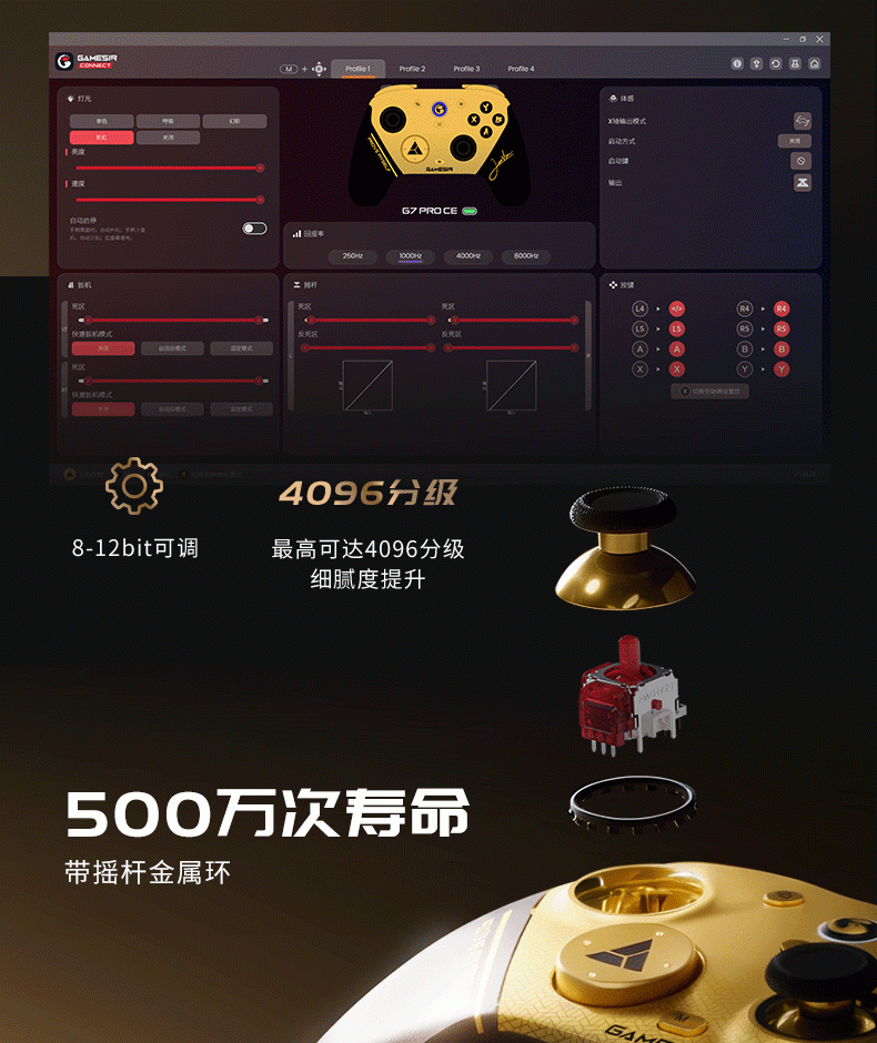还可通过PC精英软件“GameSir Connect”,进行多功能自定义调节,多种配置选择。